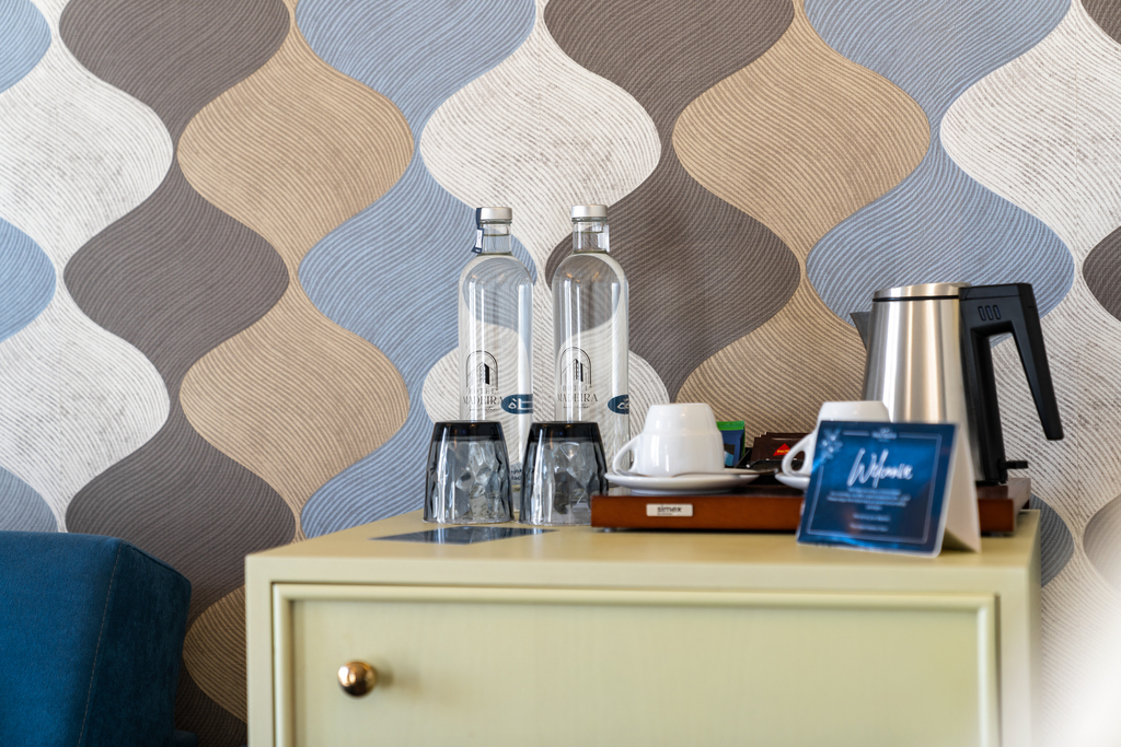 The Junior Suite is a spacious, elegant retreat for families or guests seeking an upgraded stay with added comfort and privacy. Enjoy a separate bedroom with a queen bed and a comfortable living area with a sofa bed, accommodating up to 4 guests (2 adults + 2 children). Two private balconies - each with a table and chairs - offer stunning views for outdoor relaxation. Amenities include desk, coffee/tea facilities, AC, heating, phone, TV, and free Wi-Fi. The private bathroom has a walk-in shower, hairdryer, towels, and complimentary toiletries