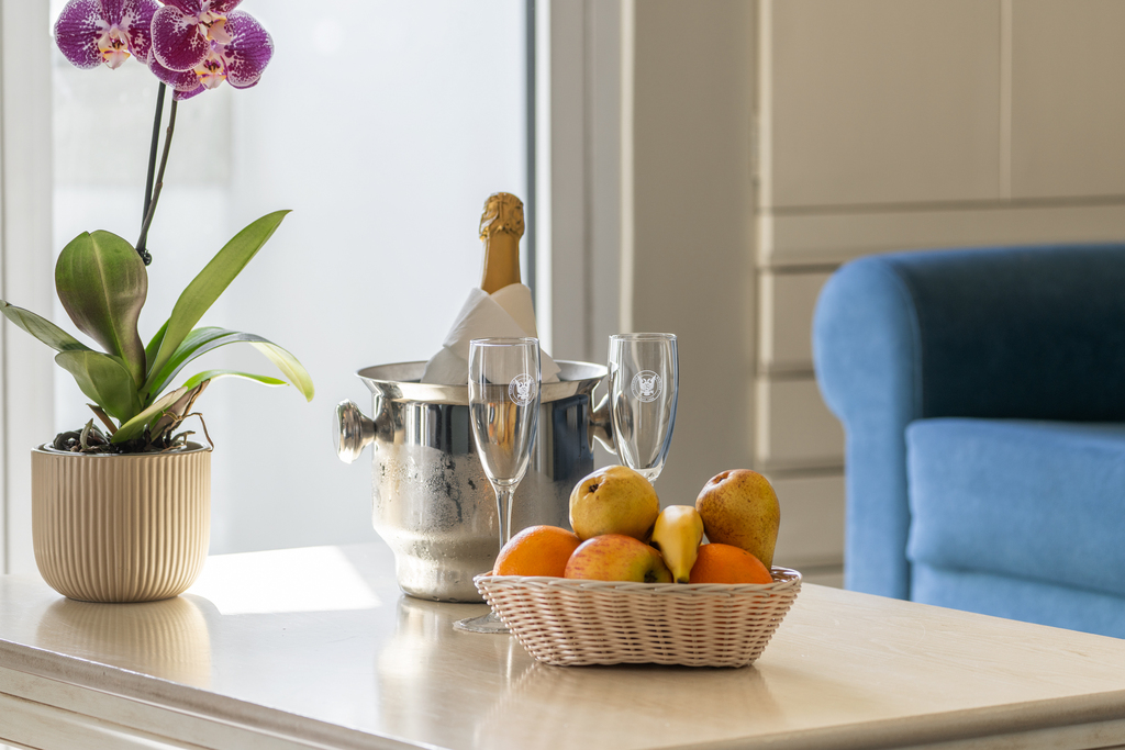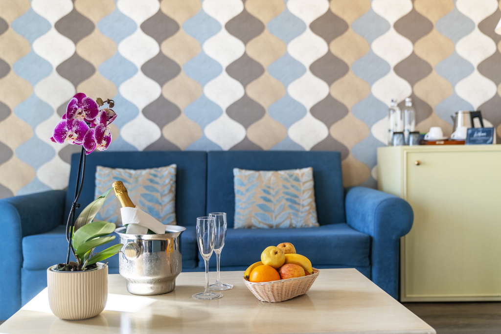 The Superior Suite is our largest and most comfortable room—an elegant space for couples or families. The layout includes an extra-king bed, sofa bed, and living area, hosting up to 4 guests (2 adults + 2 children). Two private balconies with table and chairs face the municipal garden with garden or mountain views—ideal for unhurried mornings or sunset drinks. Amenities include AC, heating, soundproofing, TV, desk, phone, coffee/tea facilities, and free Wi-Fi throughout the hotel. The bathroom has a bathtub, hairdryer, towels, and toiletries.